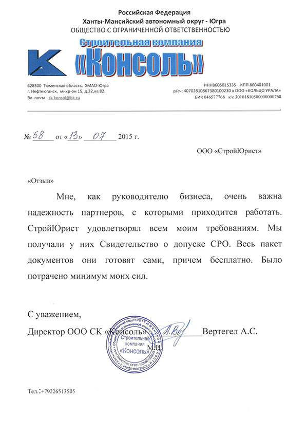 Отзывы клиентов "СтройЮрист" по вступлению в СРО в Рыбинске