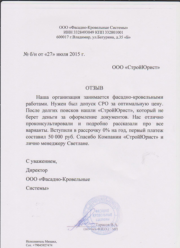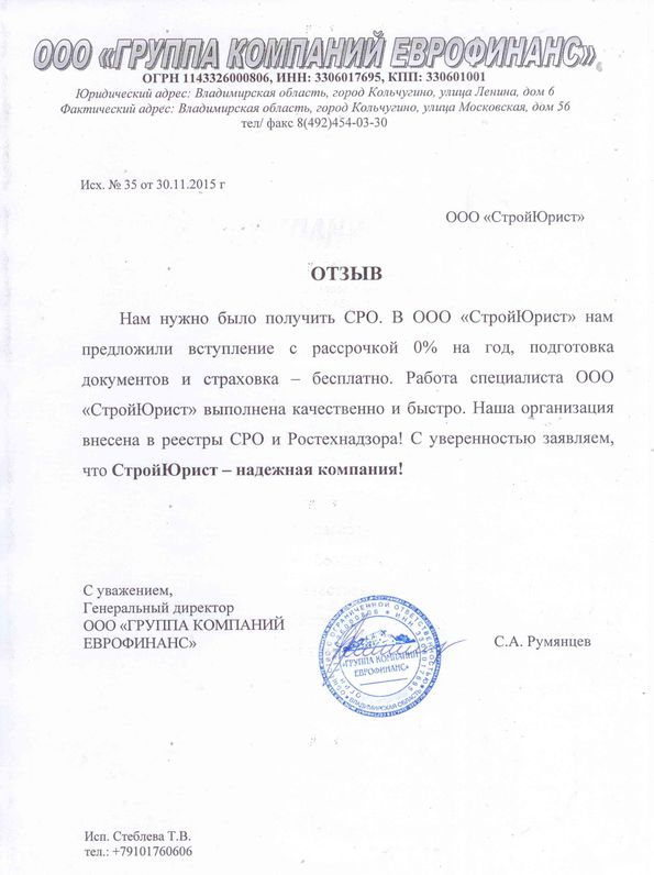 Отзывы клиентов "СтройЮрист" по вступлению в СРО в Рыбинске